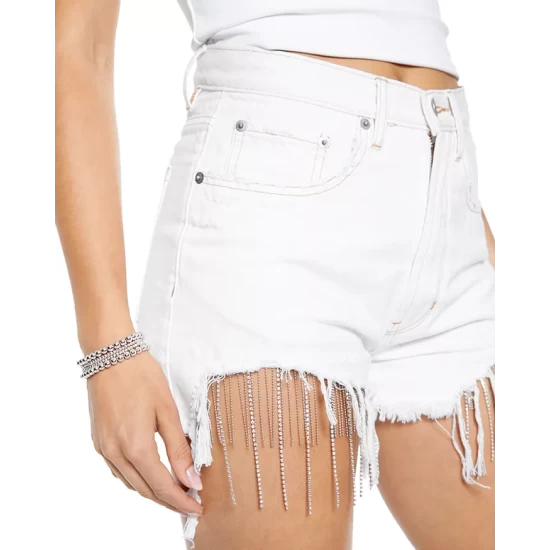 - Distressed raw hems with rhinestone chain detail at front